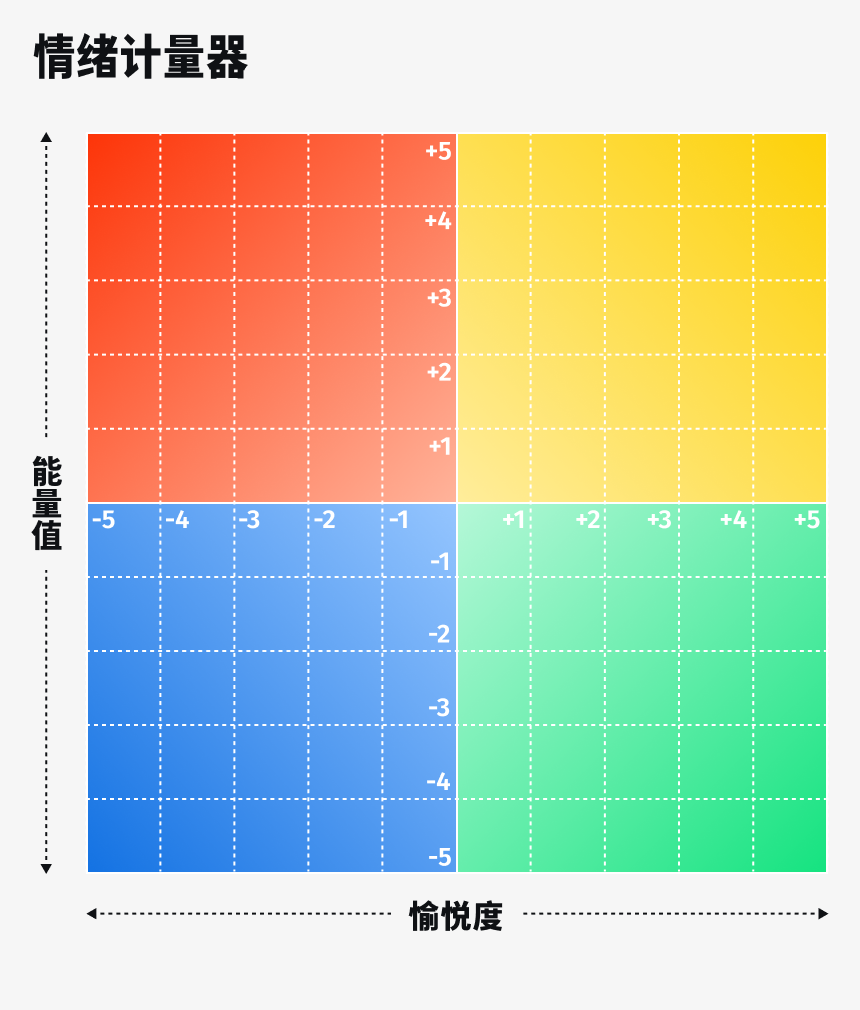 这个坐标图里,人的情绪分为两个维度,分别是「能量」和「愉悦」。