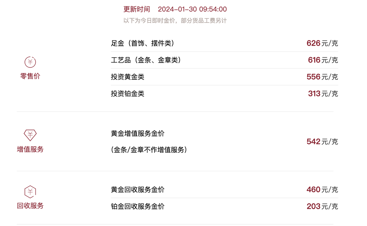 这张图来自于某家著名的品牌黄金店。虽然是去年底的数据,但这一段时间变化不会很大。我们重点看一下图里标注的零售价和下面的回收服务价格。我们以图中的足金类产品为例,也就是首饰、摆件一类,它的零售价超过 600 元/克,但是回收服务价格只有约 400 元/克。这中间足足差了 200 多元,也就是 30% 多的损失,这就是黄金饰品的损耗。