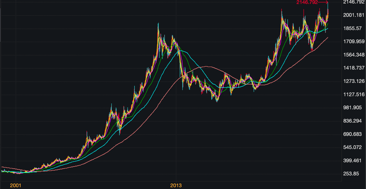 第二个特点是,黄金价格的变化周期非常长,远比股票市场的股价周期要长。所以在投资黄金的时候,我们需要有比较大的耐心。下面这张图显示的是更长周期下的黄金价格变化。