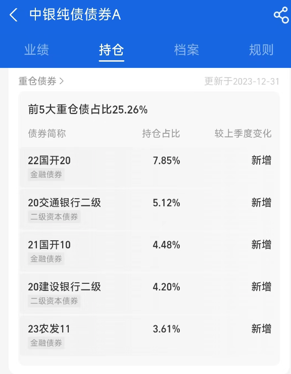 这里我以随意挑选的一支债基作为例子(不作为任何推荐,大家只当一个案例来看)。这支「中银纯债」的债基,最主要投资的是国家开发银行和其他几家大型国有银行发行的债券。